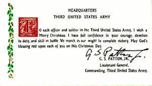| “To each officer and soldier in the Third United States Army, I wish a Merry Christmas. I have full confidence in your courage, devotion to duty, and skill in battle. We march in our might to complete victory. May God’s blessings rest upon each of you on this Christmas Day.” |